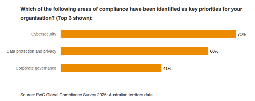 Above: According to PWCs Australian Compliance Survey, Cybersecurity tops the risk priorities for executives. Source: https://www.pwc.com.au/assurance/global-compliance-survey-australian-insights.html