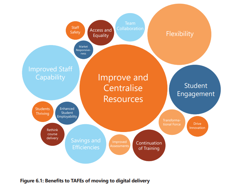 While the benefits of the new digital delivery for TAFEs were many (see Figure 6.1 in The Power of TAFE, a COVID Story), the one I’d like to draw attention to is ‘improved and centralised resources’.
