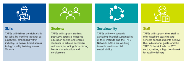 In 2024, the Victorian TAFE Network released a Statement of Priorities focusing on four key areas – Skills, Students, Sustainability and Staff – and emphasising the need for increasing internal collaboration, integration and transparency within their Network.