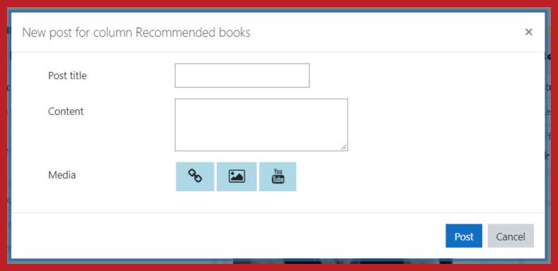 The Board activity is very intuitive. For example, Student A can simply select the + button in the Recommended books column, then fill in the information and add a URL, display an image or embed a YouTube video: